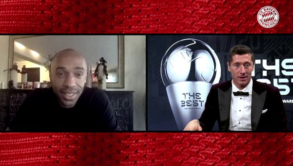 เธียร์รี่ อองรี อดีตกองหน้าตำนาน อาร์เซน่อล แสดงความยินดีกับ โรเบิร์ต เลวานดอฟสกี้ ดาวยิงตัวเก่งของ บาเยิร์น มิวนิค ที่ได้รับเลือกเหนือ คริสเตียโน่ โรนัลโด้ และ ลิโอเนล เมสซี่ ให้คว้ารางวัลแข้งยอดเยี่ยมฟีฟ่า หรือ เดอะ เบสต์ คนล่าสุด